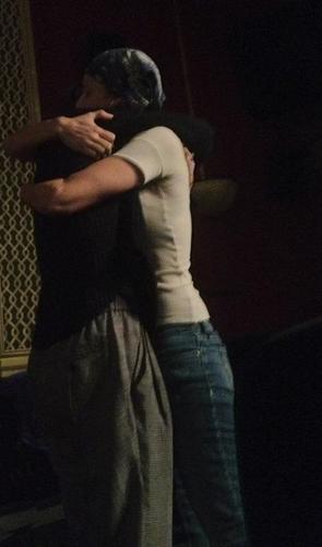 Anne Hathaway stood up and went all the way to where I was in the theater and gave me this hug (the one in the photo), a long powerful hug. She asked me my name and when she went back to talk to the audience of fellow actors she said something about me that I can't recall now. (This picture was taken from someone in the audience that went to me at the end of the event, asked for my phone number and sent it to me.)