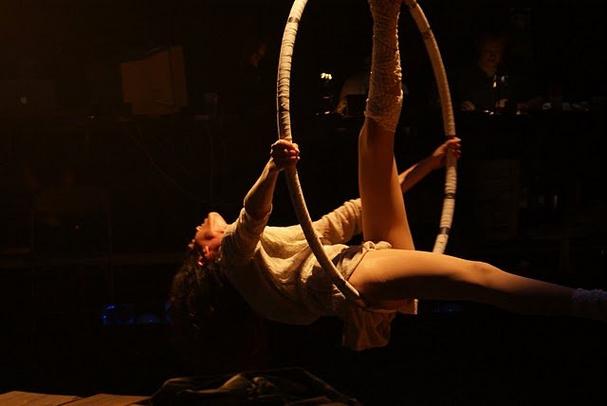 I learned how to do aerial acrobalance on a lyra for a play. The director told me at the first rehearsal to start getting stronger physically and to get over any fear of heights. "I have no fear of heights, I'm afraid of falling, that is", I replied. When I first started learning I felt I was going to pass out, I got so dizzy! My instructor, Sara Gregory, was wonderful with me, she taught me to do THIS on stage...